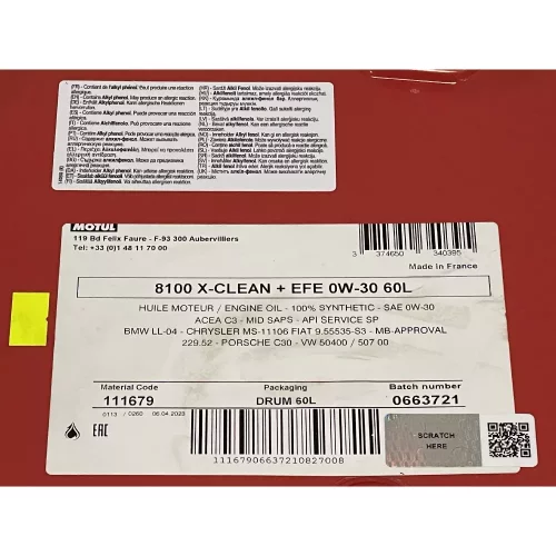 853961 MOTUL Олива моторна 100% синтетична д/авто MOTUL 8100 X-clean+ EFE 0W30 60L