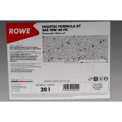 20003020099 ROWE Олива моторна HIGHTEC FORMULA GT SAE 10W-40 HC (20 L)
